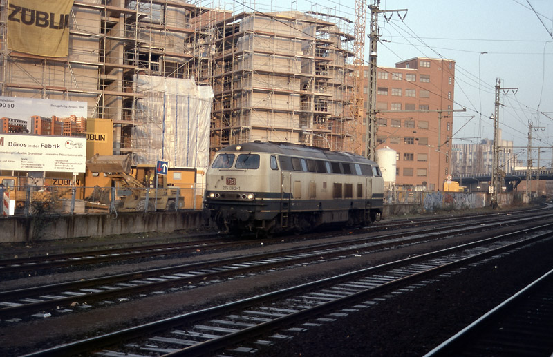 | Als 215 062 am 30.09.1997 vom Bw Ulm nach Gießen war sie noch blau-beige. In dieser Lackierung zeigte sie sich auch noch am Morgen des 10.03.1999, als sie als Lz in Frankfurt/Main West unterwegs war. |