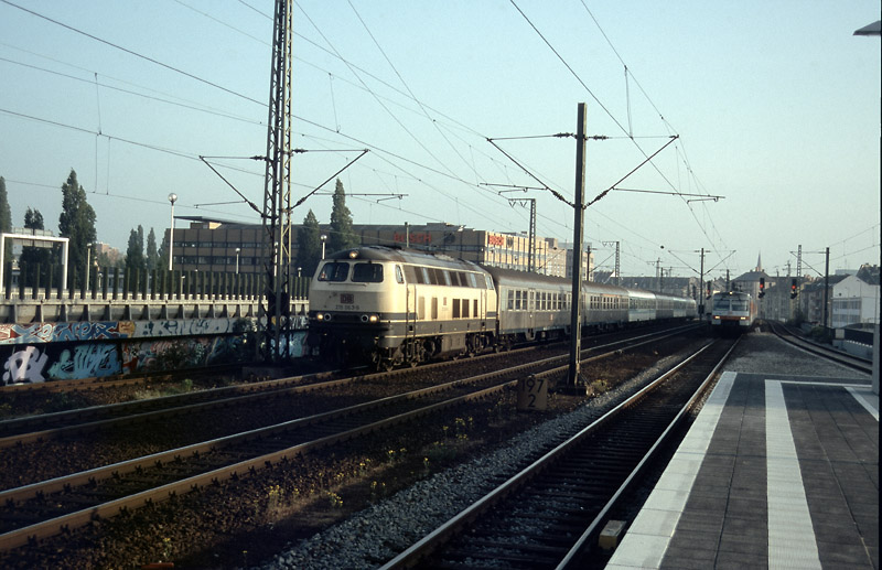 | 215 063 ist eine der wenigen Maschinen, deren Gießener Zeit nicht mit der Ausmusterung sondern mit der Abgabe an ein anderes Bw endete. Am 30.09.1997 aus Ulm nach Gießen gekommen, gehörte sie anschließend ab dem 05.11.2000 nach Köln-Deutzerfeld. Am 29.04.1999 ist sie mit SE 7059 bei Frankfurt Messe auf den letzten Metern zum Zielbahnhof Frankfurt Hbf. |