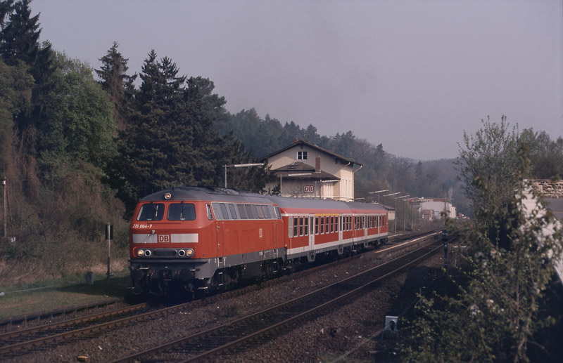 | Bei der Hauptuntersuchung zu Beginn des Jahres 2000 erhielt 215 062 dann einen verkehrsroten Anstrich, mit dem sie bis zur Ausmusterung am 06.05.2003 unterwegs war. Am 15.04.2003 präsentierte sie sich mit der abendlichen RB 95432 in Reiskirchen. |