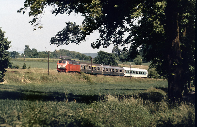 | Bei 215 065 gibt es ein paar Unklarheiten bezüglich der Stationierungsdauer in Gießen. Manche Quellen führen sie nur vom 30.09.1997 (aus Ulm gekommen) bis zum 08.10.1997 (nach Darmstadt abgegeben) als Gießener Lok. Laut anderen Quellen währte die Stationierung bis zur Umsetzung nach Köln-Deutzerfeld am 04.11.2000. Eine Abgabe nach Darmstadt erfolgte aber, wenn überhaupt, nur buchmäßig, eingesetzt wurde sie bis 2000 stets von Gießen. So auch am 26.05.1999, als sie soeben Nidda mit RB 16725 verlassen hat und gleich den nächsten Halt in Bad Salzhausen erreicht. |