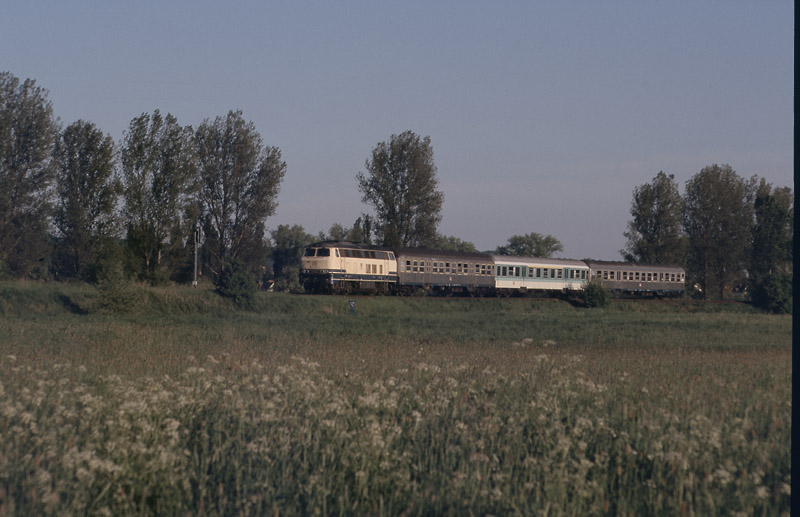| Für 215 066 sind die Stationierungsdaten wieder eindeutig: Zugang aus Köln-Deutzerfeld am 17.12.1998, Ausmusterung fast genau zwei Jahre später am 16.12.2000. Auch sie ist mit einem Bild aus der Wetterau vertreten, das sie 03.05.1999 mit RB 16738 bei Gettenau-Bingenheim zeigt. |