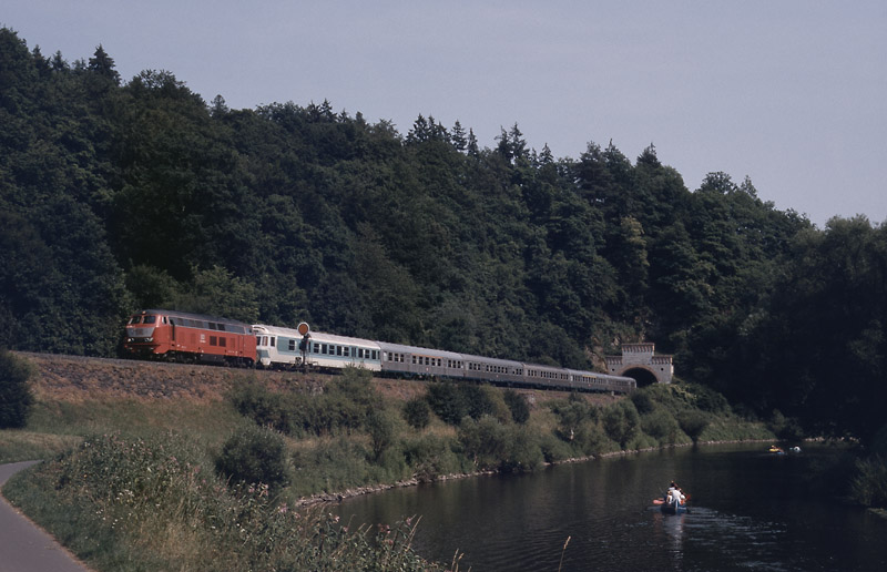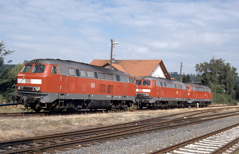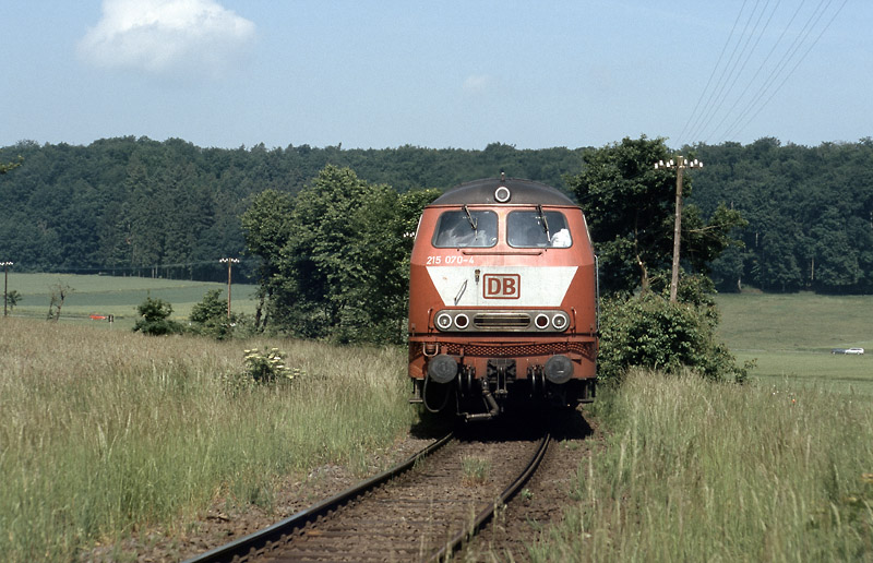 | 215 069 kam gemeinsam mit den Schwestern 068 und 070 am 26.09.1998 aus Ulm nach Gießen. Im Gegensatz zu den anderen beiden war Gießen aber nicht das letzte Bw, sie wurde am 04.11.2000 wieder nach Ulm zurückgegeben. Am 04.07.1999 war sie mit RbZ 74535 auf der Lahntalbahn bei Gräveneck unterwegs. |
