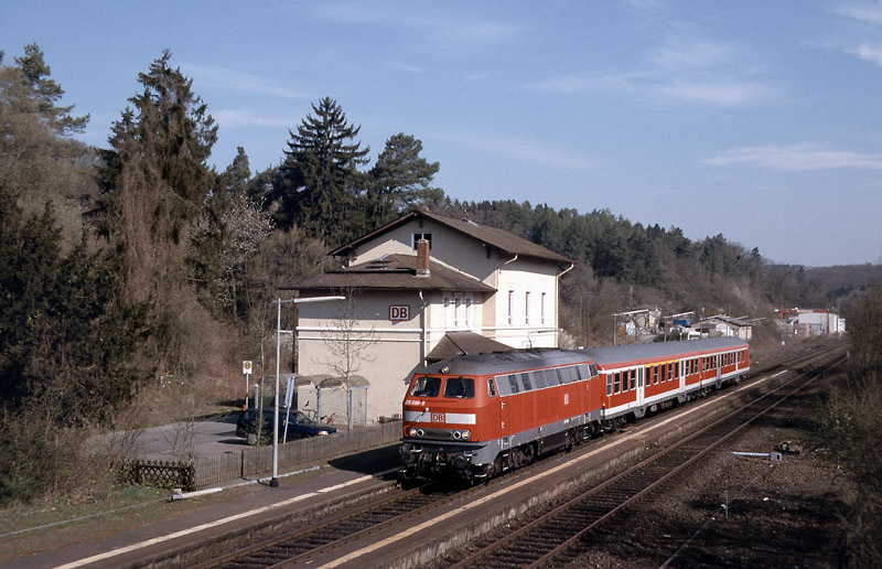 | 215 096 war einer der letzten Zugänge, sie kam am 16.06.2002 aus Darmstadt nach Gießen. Mit Ausmusterung am 06.05.2003 war sie dann auch eine derjenigen, die in Gießen "das Licht ausmachten". Am 16.04.2003 lag kein Monat Einsatzzeit mehr vor ihr, als sie mit RB 22428 einen Zwischenhalt in Villmar einlegte. |