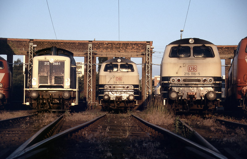 | 215 116 hat nur eine extrem kurze Einsatzzeit in Gießen aufzuweisen: Am 30.05.1999 kam sie aus Köln-Deutzerfeld nach Gießen und nur ein Vierteljahr später, am 09.09.1999, wurde sie bereits z-gestellt, die Ausmusterung folgte aber erst am 31.05.2000. Am 19.06.1999 präsentierte sie sich in bester Gesellschaft im Heimat-Bw. |
