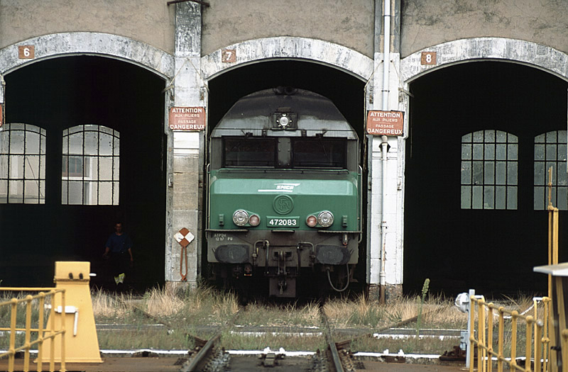 | Recht eng geht es im Lokschuppen von Montlucon zu. 72083 wird nach dem Tanken am 01.08. abgestellt, der Lokführer muss den Schuppen durch den Nachbarstand verlassen! |