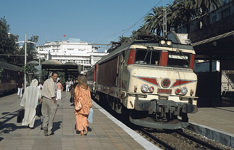 Der Gang zum vorgebuchten Ibis-Hotel erweist sich als Flop, das ist nämlich nicht am Bahnhof Ville sondern am Bahnhof Agdal! Also mit dem nächsten Zug wieder eine Station zurück. Beim Verlassen des Bahnhofs sehen wir auch gleich das Hotel und erhalten gleichzeitig jede Menge Angebote „Taxi!“. Wir verzichten auf den Spaß „Hotel Ibis!“ zu sagen und legen die 50 Meter per pedes zurück. Nach dem Einchecken statten wir dem Bahnhof noch einen Besuch ab. Nach ein paar Fotos verschiedener Züge (überraschend problemlos, keiner fragt nach Genehmigung o.ä.) kaufen wir auch gleich noch für das nächste Wochenende die Schlafwagenkarten für die Rückfahrt Oujda-Casablanca. Das fordert wegen unserer rudimentären Französisch-Kenntnisse zwar neben dem Einsatz von Papier und Stift auch die Konsultation von immerhin drei Fahrkartenverkäufern aber am Ende haben wir dann das, was wir haben wollen. Zurück im Hotel gibt’s dann doch das erste „Ramadan-Problem“. Bis 20:00 Uhr ist erst einmal das Ramadan-Buffet für die Einheimischen, wir müssen uns leider noch gedulden. Das erledigen wir in der Bar bei gut gekühlten „flag speciale“ (Internationale Hotels als einziger Bezugsort für Bier!) und genießen im Fernseher eine marokkanische Soap. Endlich gibt’s dann auch für uns Essen und der anschließende Verdauungsspaziergang führt uns zur benachbarten Hauptverwaltung der ONCF, wo Stephan durch den Zaun noch ein paar Nachtaufnahmen des vor dem Gebäude stehenden Dampflokdenkmals schießt.