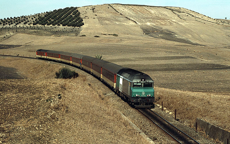 Wir entscheiden uns, an dieser Stelle zu bleiben und auch noch den Gegenzug 304 hier zu verarzten. Er ist mit DF-116 bespannt, der nächsten grünen Französin, und jetzt nerven sie langsam (siehe Gedanke vom Vormittag), schließlich sind wir wegen den marokkanischen Maschinen hier, FRETchen kennen wir von der SNCF schon genug. Auf jeden Fall kommt jetzt erst einmal eine längere Zugpause. Wir suchen schon die nächste Fotostelle auf, eine Feldwegbrücke südlich des Bahnhofs von Arbaoua und halten dort im Schatten eines Baumes Siesta. Nachdem wir uns vergewissert haben, dass weit und breit niemand kommt, kann man auch mal mit Bananen und Keksen den Ramadan brechen. Nach unserer Mahlzeit kommt dann doch jemand, nach der Aufschrift am Jeep wohl zwei Mann von der Forstverwaltung, die die üblichen Fragen „Wer? Was? Warum?“ platzieren, die wir aber von der Harmlosigkeit unseres Tun überzeugen können. Nicht bald danach kommt dann auch Express 305 von Tanger angefahren im Schlepp von, na was wohl: DF-115, die vierte noch fehlende FRET. Alle Express heute in Grün, das nervt. Die folgende Pause bis zum nächsten Zug nutzen wir, um uns im nahe gelegenen Ksar el Kebir nach Fotomöglichkeiten umzuschauen. Natürlich geraten wir wieder mitten in eine Marktstraße und so kommt auch Stephan, der heute mit dem Fahren dran ist, mal in diesen Genuss. Von einer noch nicht fertigen Straßenbrücke gibt es ein Motiv „Stadtdurchfahrt“, dass wir in unsere To-Do-Liste aufnehmen, bevor wir noch einmal an den Bahnhof Arbaoua zurückfahren. Den letzten Express des Tages wollen wir bei der Bahnhofsdurchfahrt von der Brücke aufnehmen. Eigentlich ein Streiflichtmotiv geht aber „rechtzeitig“ die Sonne weg, müßig zu erwähnen, dass jetzt mit DF-102 die einzige Leistung einer Original-Lok mit einem Express auftaucht.