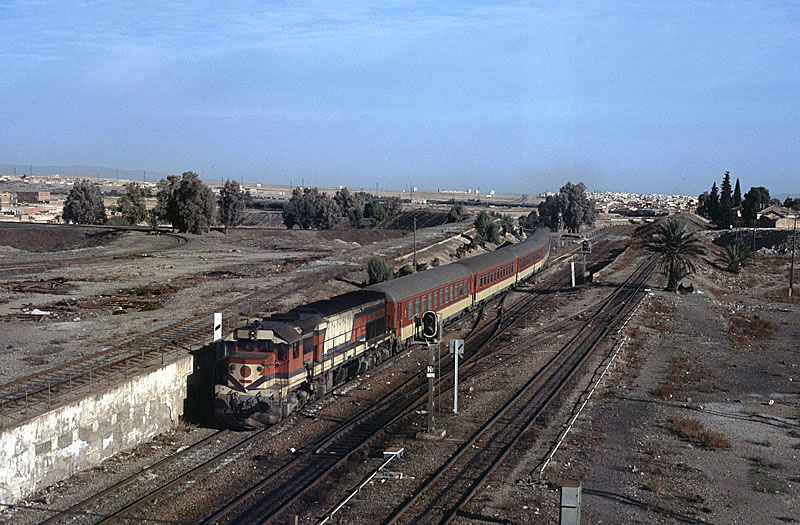 | Das erste Bild des Tages: DH-366 mit Zug 203 in der Einfahrt nach Oujda. Die Gleise in der Mitte führen zur geschlossenen algerischen Grenze. |