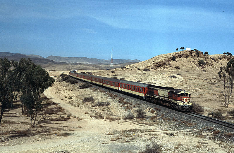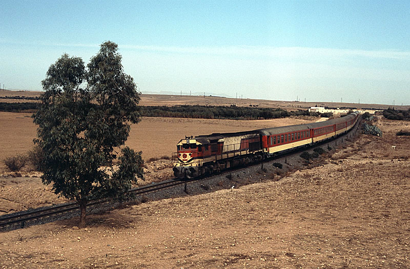 Wir umrunden dann noch einmal weiträumig das Bw-Gelände aber es gibt keine Stelle zum „Einsickern“. Also fahren wir ein paar Kilometer der Strecke entlang aus der Stadt hinaus und postieren uns im Schatten einiger Bäume an einer günstigen Fotostelle, die auch den direkten Start zur Verfolgung des Güterzuges bietet. Die Wartezeit nutzen wir zu einem Telefonat mit der Mietwagenagentur. Wir können am Nachmittag den Wagen im Büro in der Stadt, das sich direkt neben Bahnhof und Hotel befindet, abgeben und müssen nicht – wie es die Internetbuchung vorgab – raus zum Flughafen, praktisch. So warten wir auf den Güterzug, der nicht um 10:00 Uhr, auch nicht um 10:30 Uhr und erst recht nicht um 11:00 Uhr kommt und uns wird klar, dass er heute entgegen der Auskunft vom Vorabend auch wieder ausfällt, Feiertag halt. Die Konsequenz ist: Es bleibt uns nur noch der Express 204, Oujda ab 13:10 Uhr, mehr wird es heute nicht geben, denn um 16:00 Uhr will der Vermieter das Auto zurück haben. Und so ist der fotomäßige Verlauf des Tages recht schnell erzählt: Nach insgesamt vier Stunden Warten erlegen wir am Stadtrand von Oujda DH-360 mit dem Express nach Fez, nach der Vorbeifahrt rein ins Auto, hinterhergerast nach El Aioun, dort der zweite Abschuss, Feierabend.