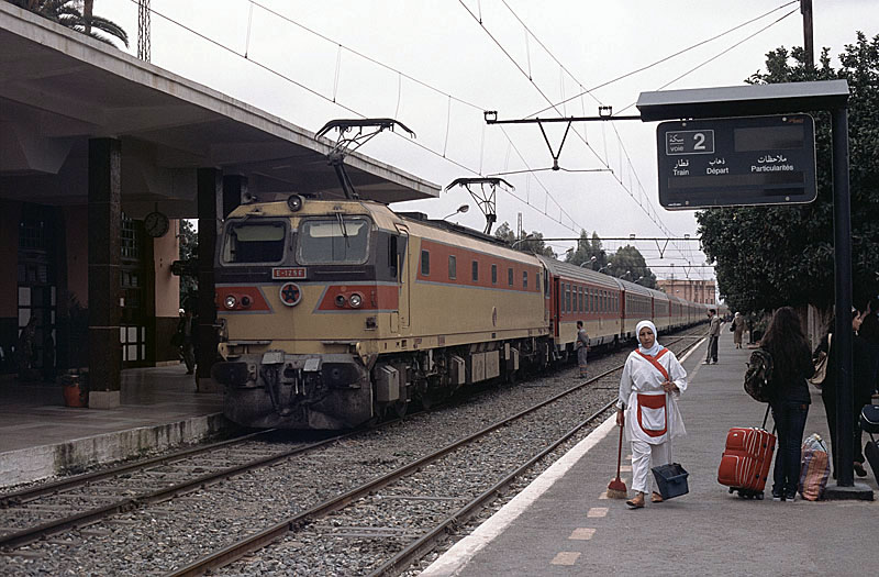 | E-1256 nach der Ankunft mit "unserem" Zug in Marrakech. Die Dame in weiß gehört übrigens wie ihre Ausrüstung erkennen lässt zur marokkanischen BRG und war mit rund einem halben Dutzend Kolleginnen pausenlos um das perfekte Erscheinungsbildes ihres Bahnhofes bemüht! |