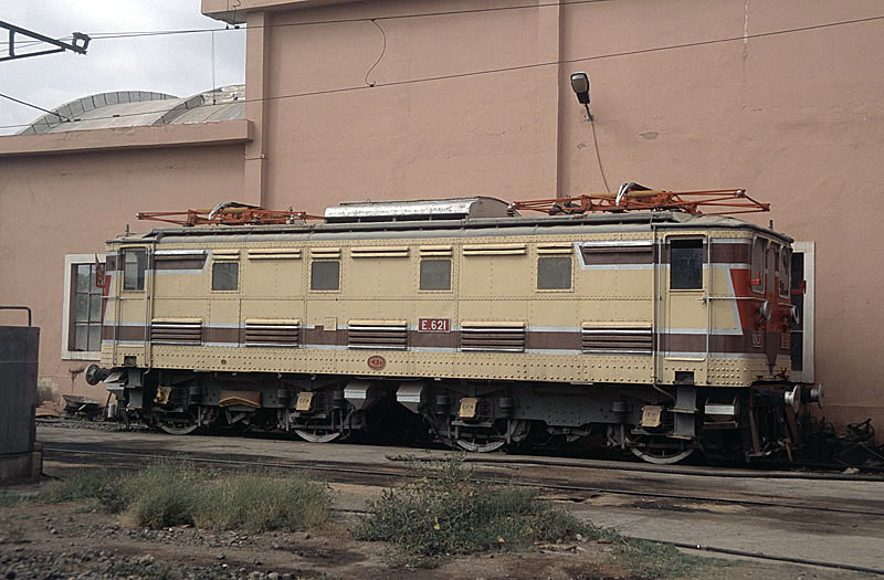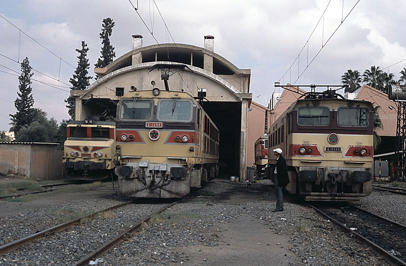 | Internationale Übersichtsaufnahme im Bw Marrakech mit E-1256, E-1122 (beide aus Japan), E-621 (Frankreich) und DG-218 (Polen) |
