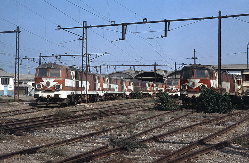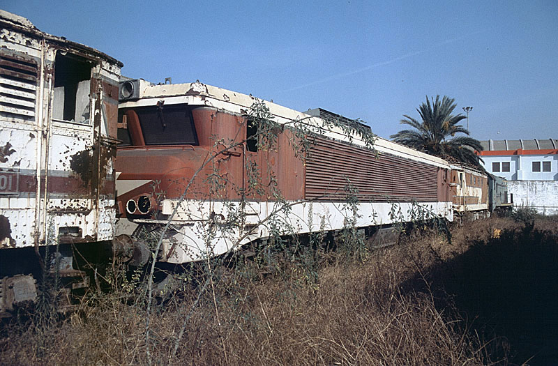 Der letzte Tag beginnt mit der Rückfahrt nach Casablanca. Auf dem Bahnhof angekommen entdecken wir in dem noch auf einem Nebengleis abgestellten Park für unseren Schnellzug einen Eurofima-Wagen, der einst als Prototyp nach Marokko geliefert wurde aber keine Nachfolgeaufträge auslöste. Unseren Entschluss „Sch... auf die Platzreservierung, wir fahren in dem!“ können wir dann aber leider doch nicht umsetzen, denn bei der Bereitstellung des Zuges bleibt der Einzelgänger auf dem Abstellgleis zurück. So beziehen wir unsere reservierten Plätze und haben im Gegensatz zum Vortag nun das Abteil für uns. Nur kurz nimmt ein altes Ehepaar bei uns Platz, verzieht sich aber recht schnell wieder!? In Casablanca angekommen sind es wieder nur wenige Schritte zum benachbarten Ibis und nach dem Abstellen des Gepäcks im Zimmer startet der letzte Programmpunkt: AW-Besichtigung in Casablanca wegen der dort schon aus dem Zug gesichteten abgestellten E-1000 aus polnischer Produktion. Dank Digitalkamera „bewaffnen“ wir uns im Hotelfoyer noch mit den benötigten Ausschnitten des Stadtplans und machen uns zu Fuß auf den Weg. Auf dem Bahnhofsvorplatz wimmelt es gleich wieder von „Fremdenführern“ und anderen Touri-Abzockern („You go this hotel? Bad and dirty! I know better!”), die wir aber mit Missachtung strafen. Unser Weg führt uns entlang der Bahnanlagen vorbei an einer Molkerei sowie unzähligen Imbissbuden mit Holzkohlegrill, alles in unmittelbarer Nähe von LKW-Wracks, auslaufendem Öl etc., ein Szenario, in dem man sich einen Mitarbeiter der deutschen Gewerbeaufsicht gar nicht erst vorstellen will. An der AW-Pforte angekommen erhalten wir auch Einlass und werden zunächst einmal in einem großen Konferenzraum zwecks Warten platziert. Interieur – und auch die ausgehängte Inventarliste – scheinen schon einige Jahrzehnte auf dem Buckel zu haben und ein Vergleich von Soll und Ist ergibt, dass nur bei den an der Wand hängenden Portraits von König, Ex-König und Kronprinz keine Differenz besteht, ansonsten gilt auch hier „Etwas Schwund ist immer“. Immerhin werden wir nach dieser kurzen Inspektion der Einrichtung recht bald zum Chef eingelassen, dem wir unsere Begehr nach den E-1000 vortragen. Nach einigem Hin und Her erteilt er uns die gewünschte Fotogenehmigung. Während des Gesprächs drückt er mindestens ein halbes Dutzend mal auf den Klingelknopf an der Wand und stets erscheint sofort mit Verbeugung ein buckliger, alter Mann, um neue Orders entgegenzunehmen. Die letzte betrifft das Heranrufen eines Aufpassers und dann dürfen wir losziehen. Vor der Halle stehen rund zehn E-1000 und nur die dürfen wir laut unserem Begleiter fotografieren, die daneben stehenden AW-frischen E-1300 sind „Off Limits“, verstehe das wer wolle.