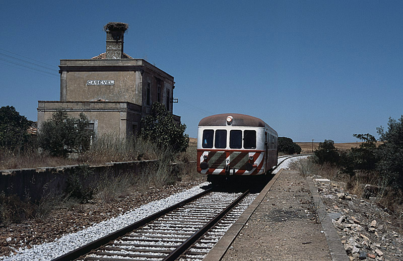 | Ein Glücksfall war es, dass rund um Beja mit dem Triebwagen 0106 aus dem Jahre 1948 der letzte Vertreter dieser von Nohab gelieferten Baureihe noch im Einsatz war. Am 01.08.2006 passiert er auf dem Weg von Beja nach Funcheira den schon seit Jahren verwaisten Bahnhof von Casevel. In der offenen Landschaft war der Bahnhof schon von weitem sichtbar und ich betitelte ihn als "morbid", ein vor dem Bahnhof liegendes Hundegrippe bestätigte diesen Eindruck... |