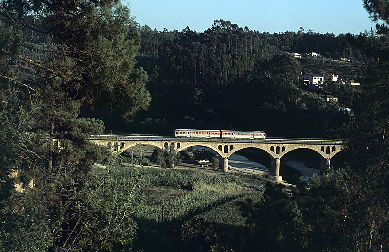 | Motivlicher Höhepunkt dieser Schmalspurbahn ist die unmittelbar am Bahnhof Sernada gelegene kombinierte Schienen-/Straßenbrücke über den Fluss Vouga. Am Abend des 05.08.2006 kommt Triebwagen 9635 von der Küstenstadt Aveiro und hat in wenigen Sekunden Feierabend. |